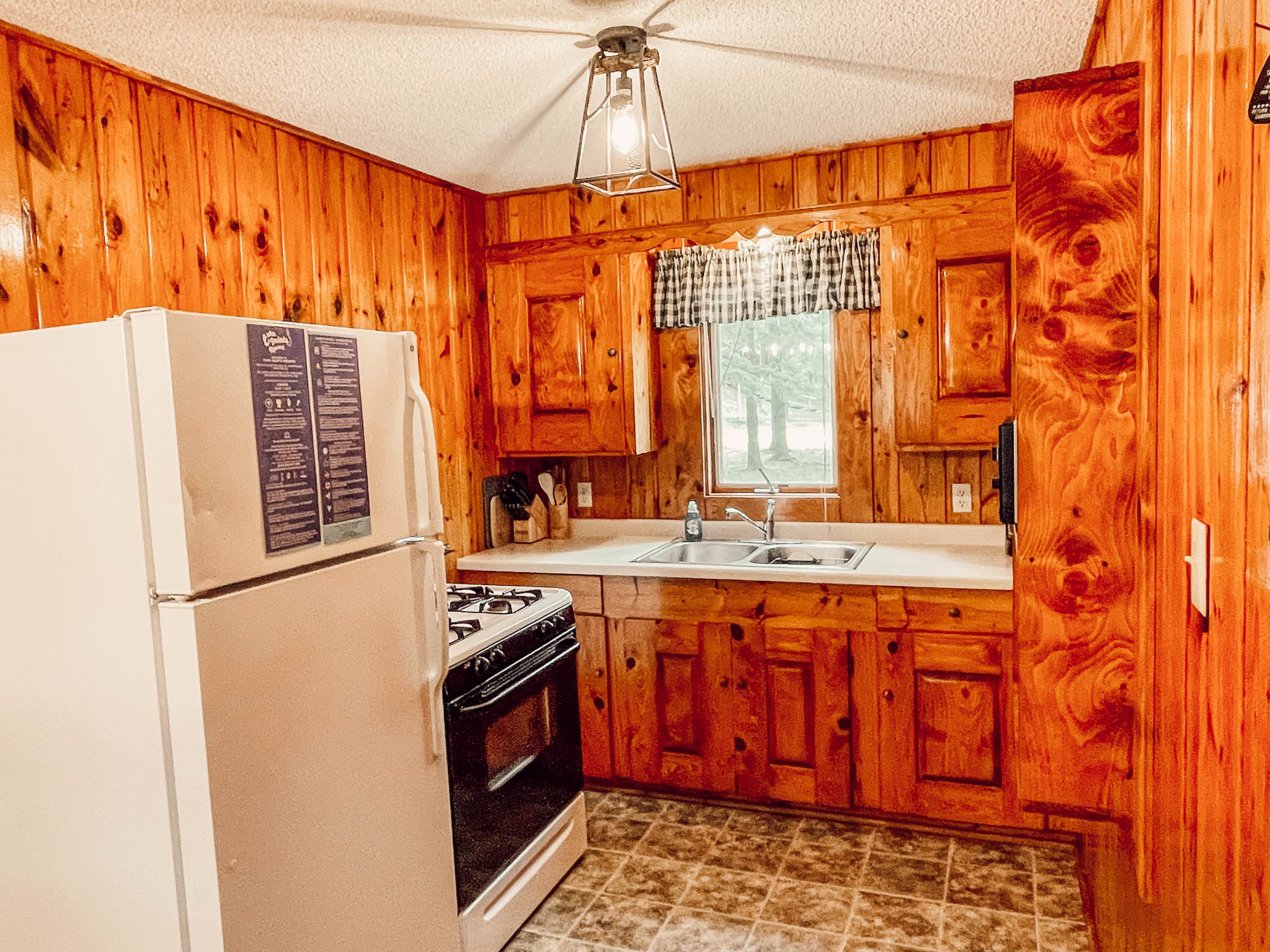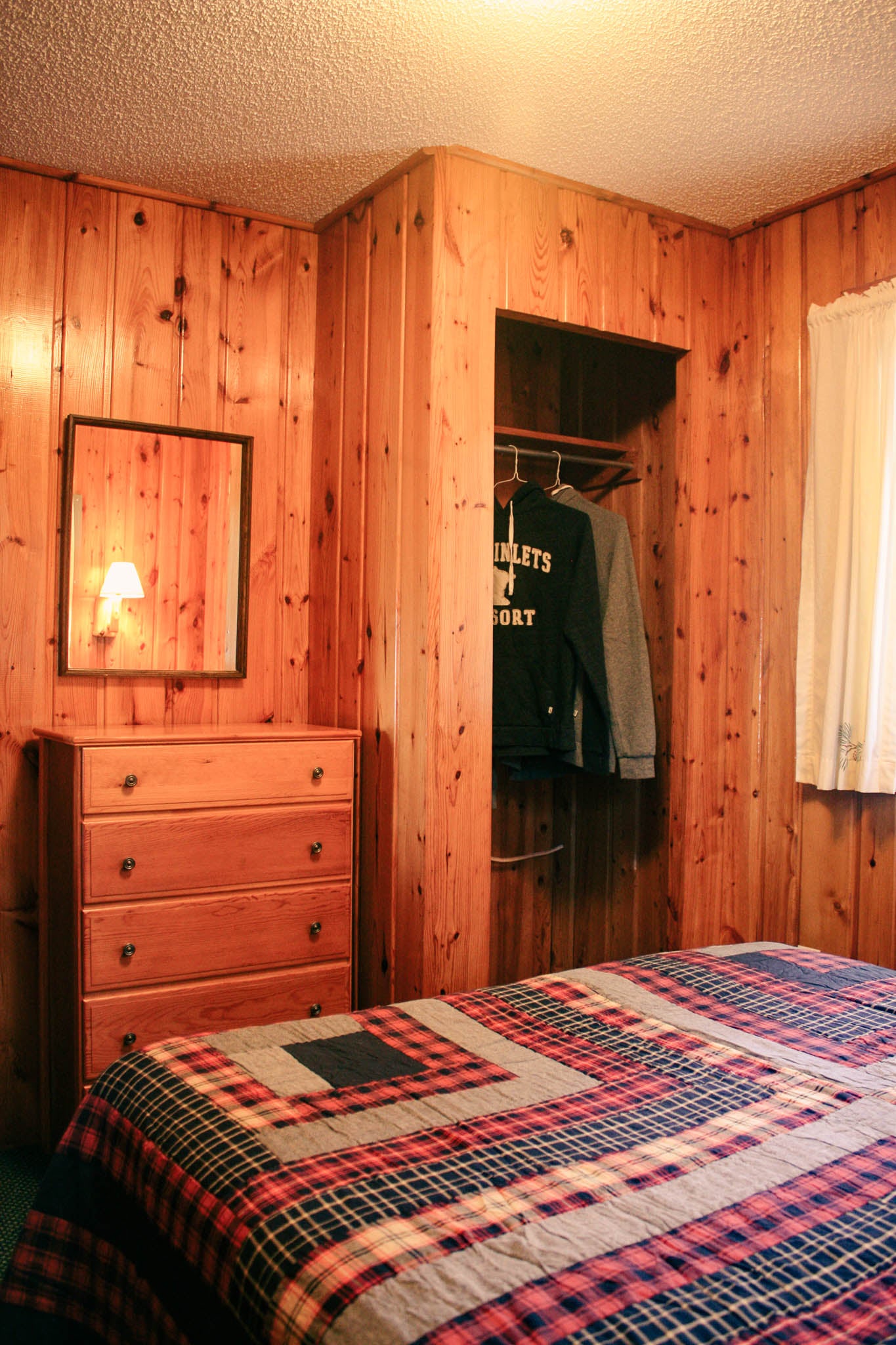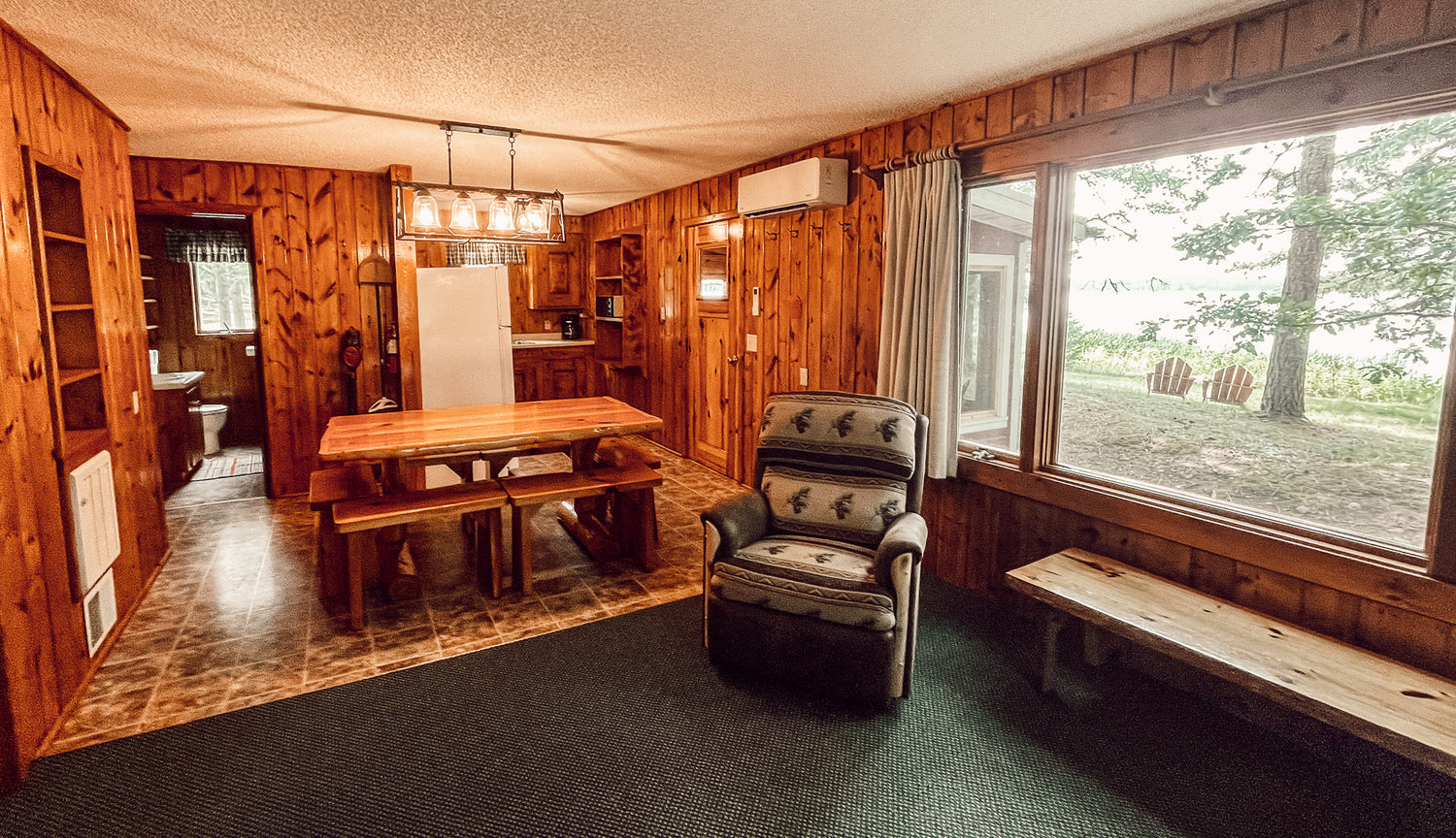 Knotty pine interior with large picture window facing the lake. Bedrooms have two queen and one double bed. Carpeted living room and bedrooms. One bath with tub & shower. Full kitchen. Air Conditioning added in 2021. Lakeside screened porch. Pull out couch in living room.