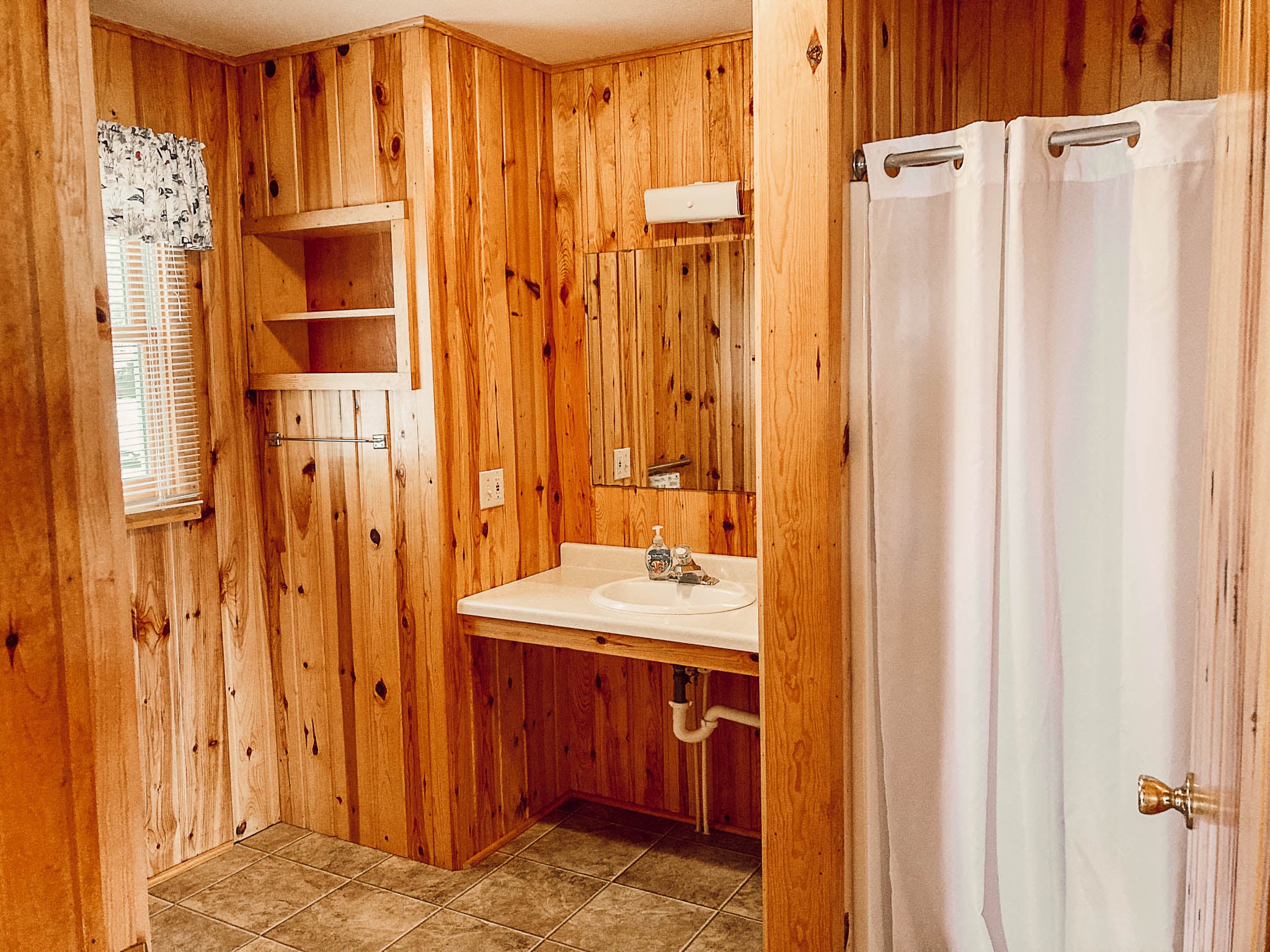 Featuring knotty pine interior with large picture window facing the lake. Vaulted ceiling with ceiling fan, heat and air conditioning. Each bedroom has one queen bed. Carpeted bedrooms. One large bath with shower and grab bars. Full kitchen. Lakeside screened porch. Pull out sleeper in living room.