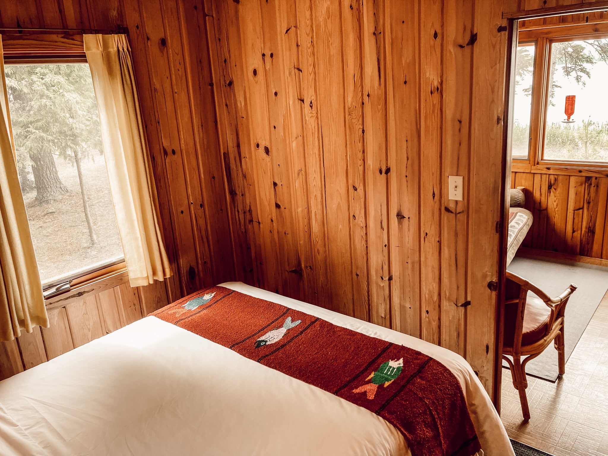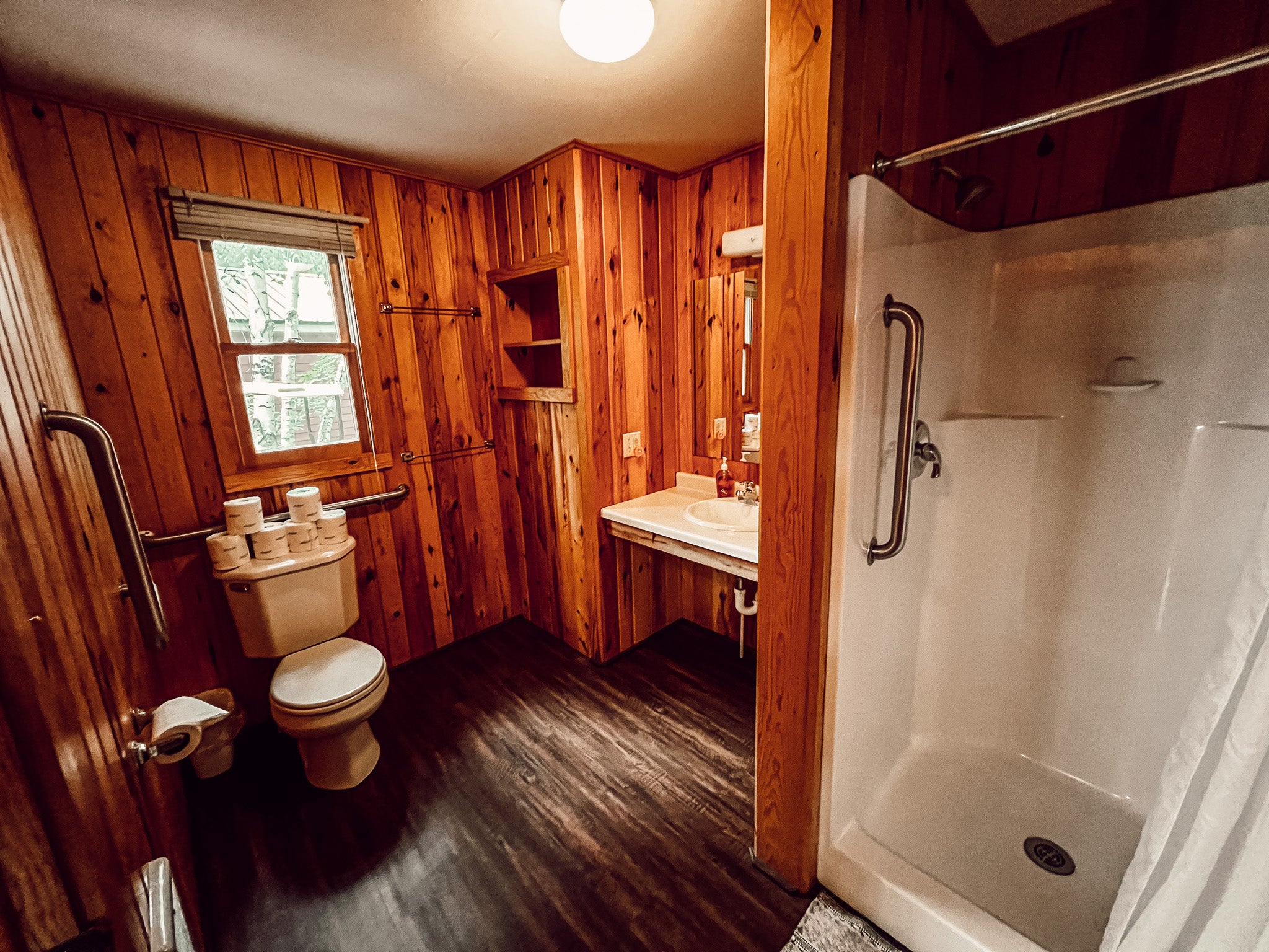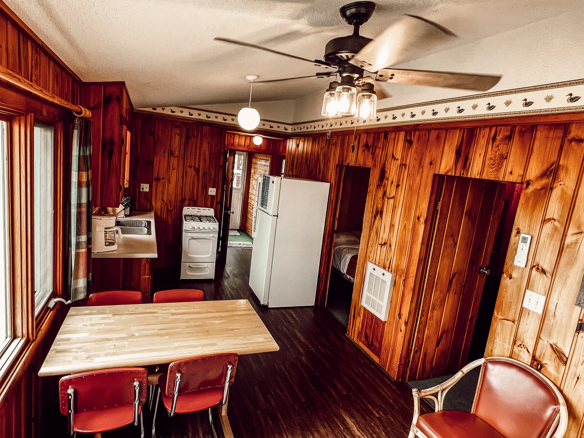 This cabin features knotty pine interior with large picture window facing the lake. Bedrooms include one queen and one full size bed, both carpeted. A/C and heat. Large bathroom with shower and grab bars. Full kitchen. Lakeside screened porch. Pull out futon in living room.