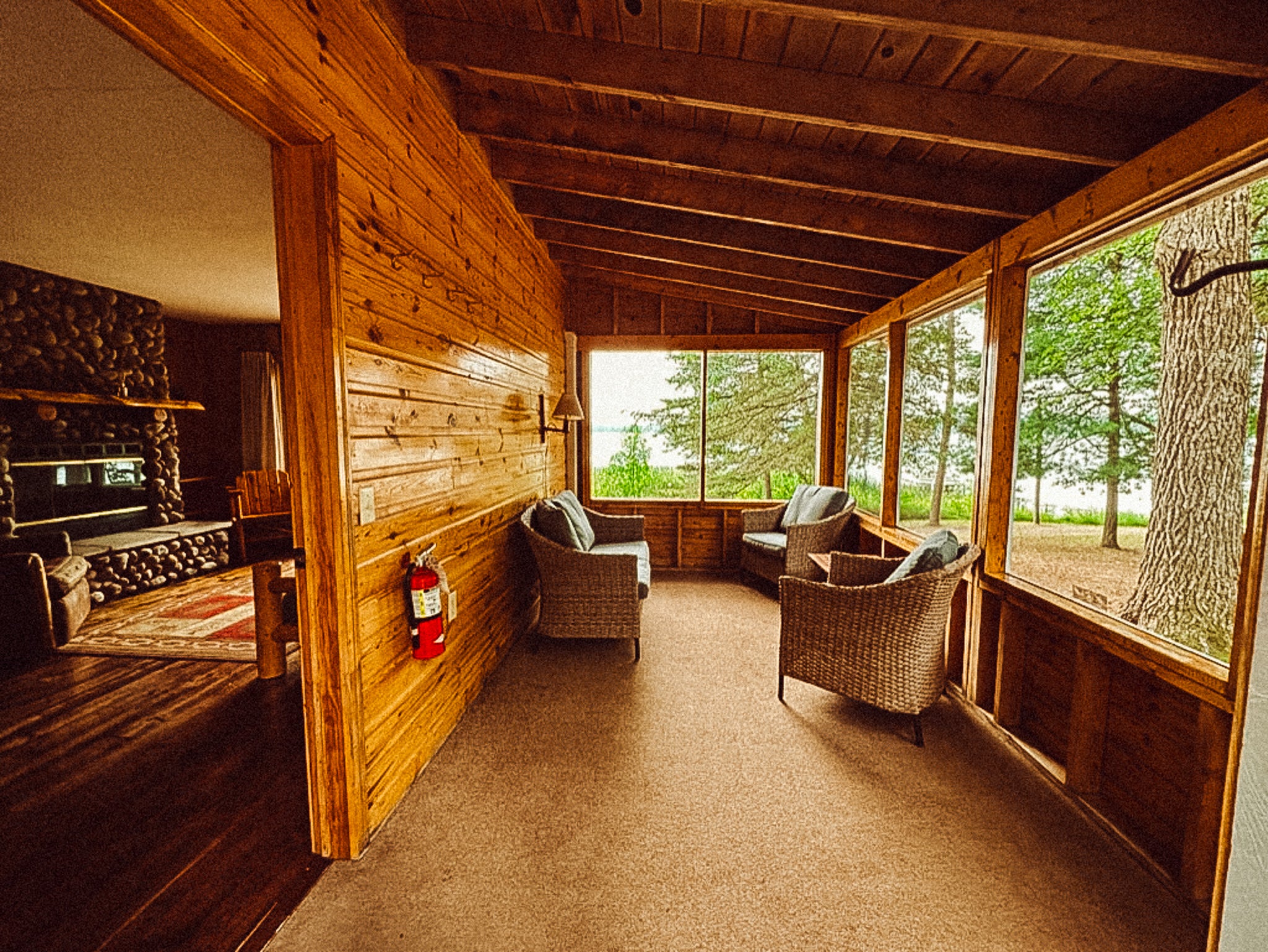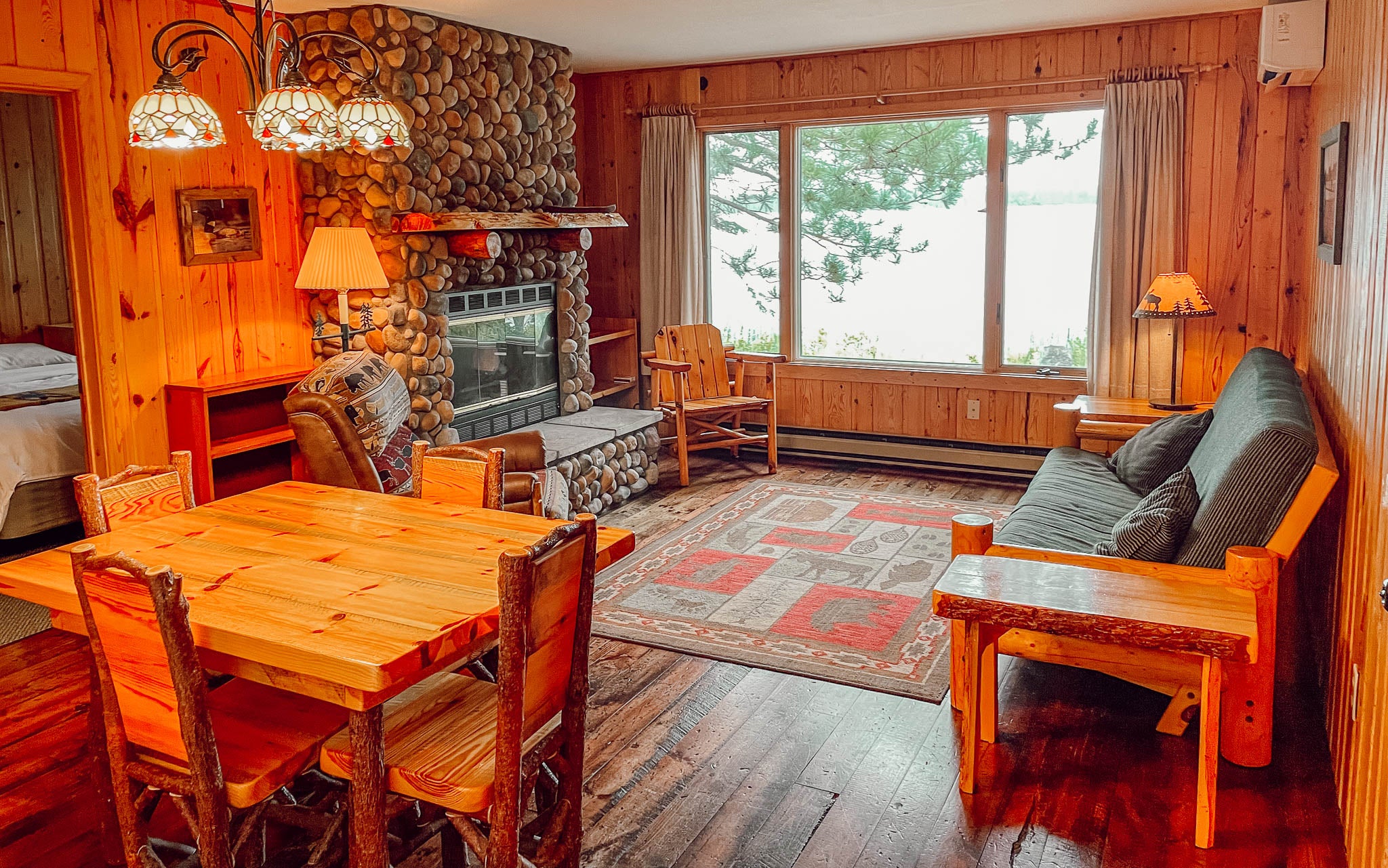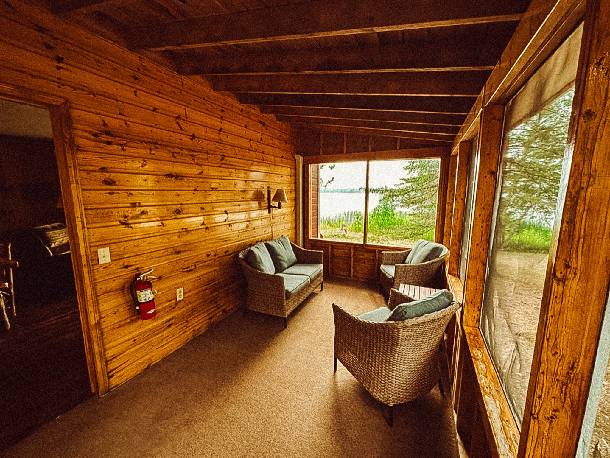 Knotty pine interior with large picture window facing the lake. Bedrooms have one queen bed in one room, and one queen and one twin in the other. Carpeted living room and bedrooms, air conditioning and heat. One bath with tub & shower. Full kitchen. Lakeside screened porch. Fold down sleeper in living room.