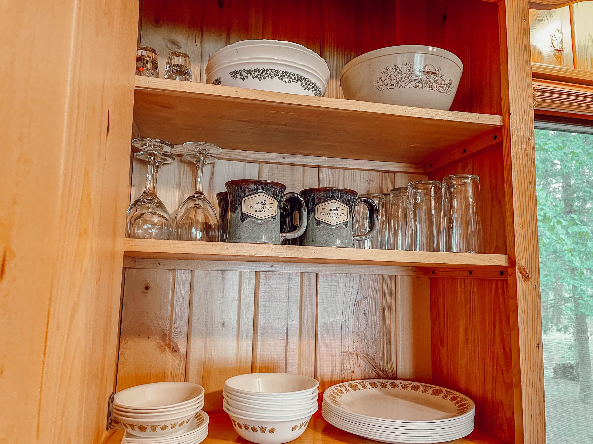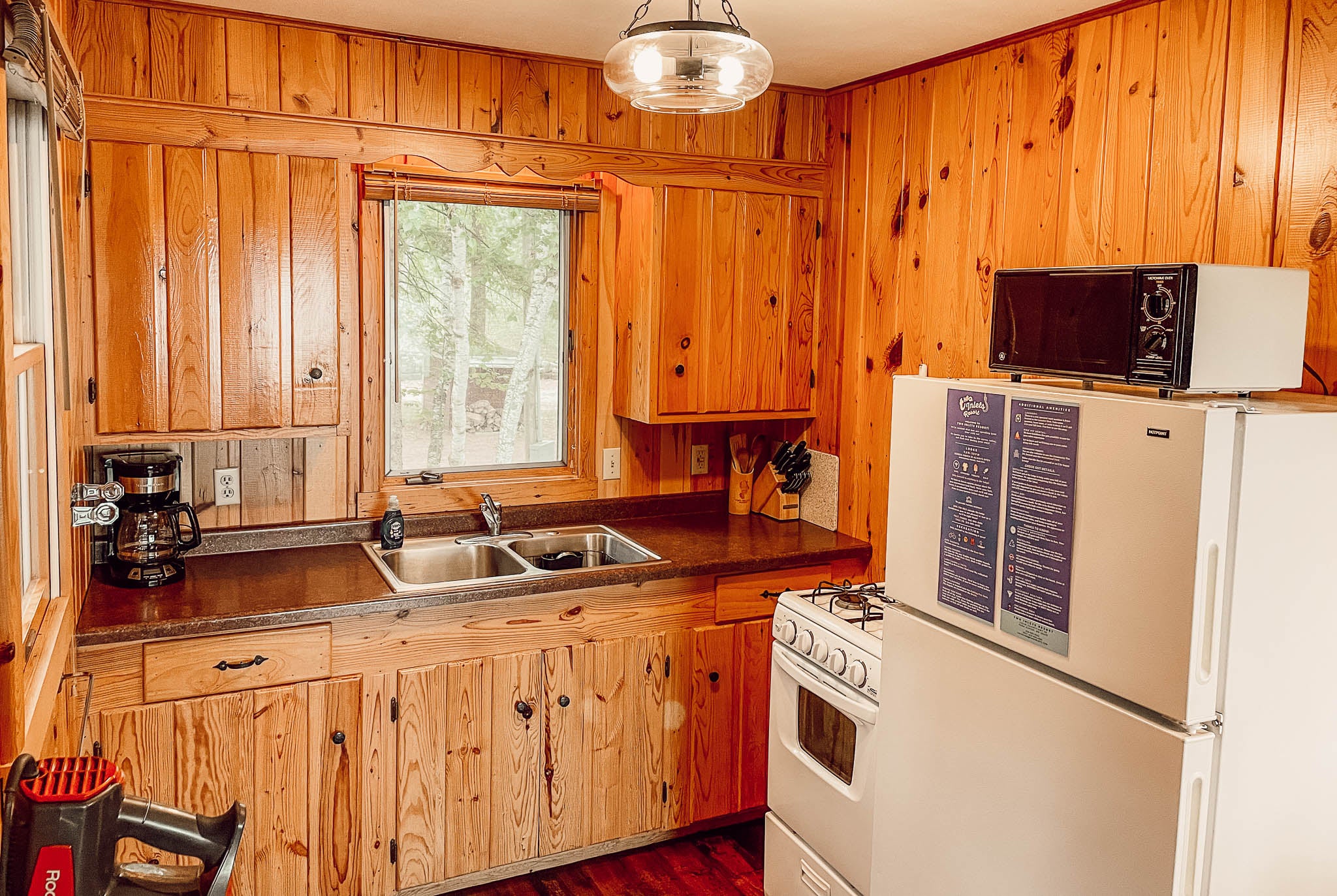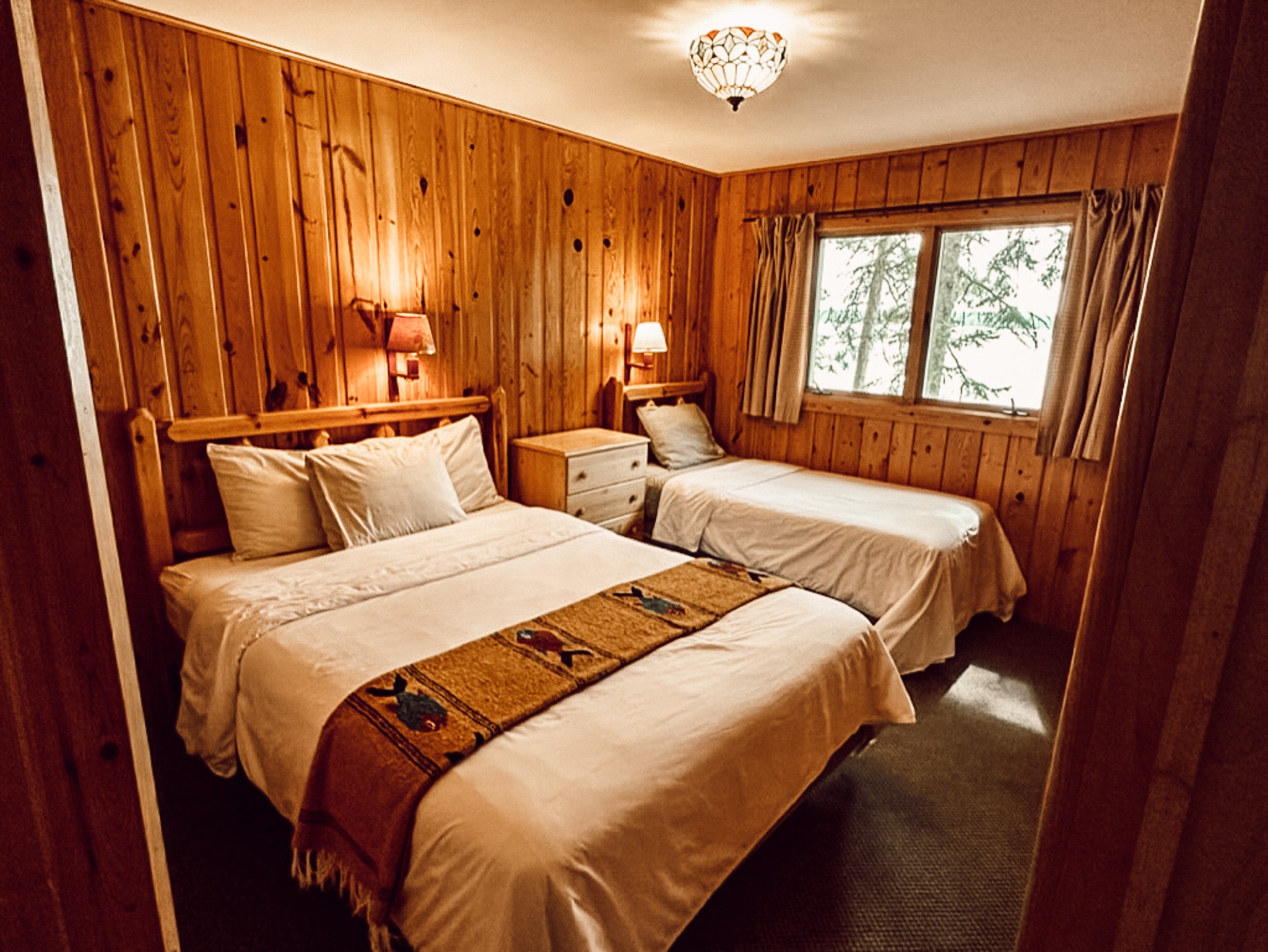 Knotty pine interior with large picture window facing the lake. Bedrooms have one queen bed in one room, and one queen and one twin in the other. Carpeted living room and bedrooms, air conditioning and heat. One bath with tub & shower. Full kitchen. Lakeside screened porch. Fold down sleeper in living room.