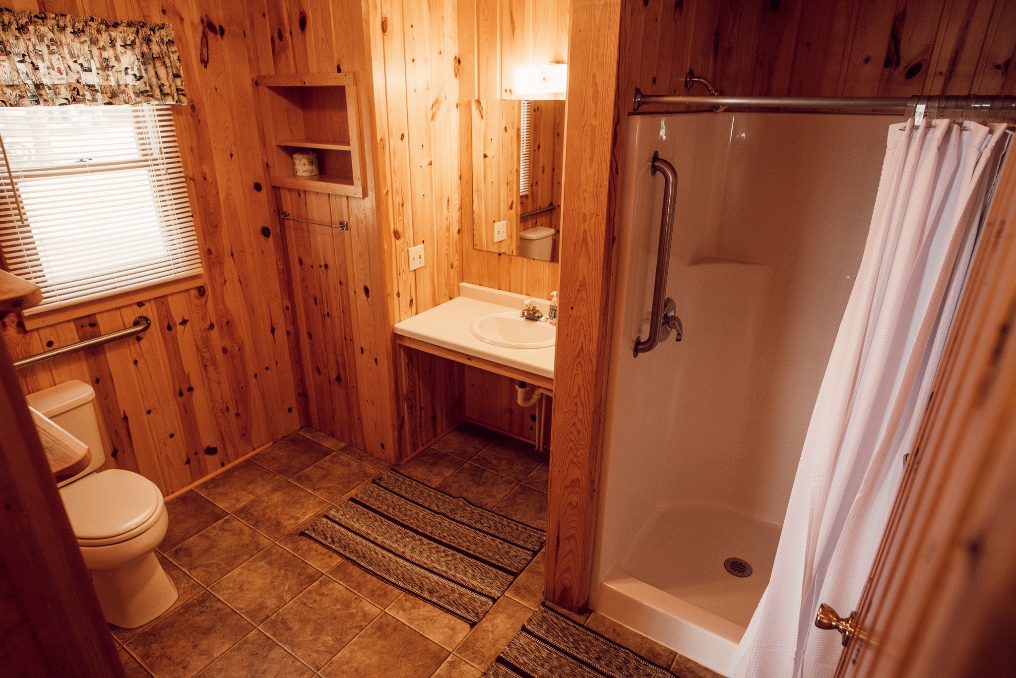 Vaulted ceiling with ceiling fan, air conditioning, and heat. Each bedroom has one queen bed. Carpeted bedrooms. One large bath with shower and grab bars. Full kitchen. Lakeside screened porch. Pull out sleeper in living room.