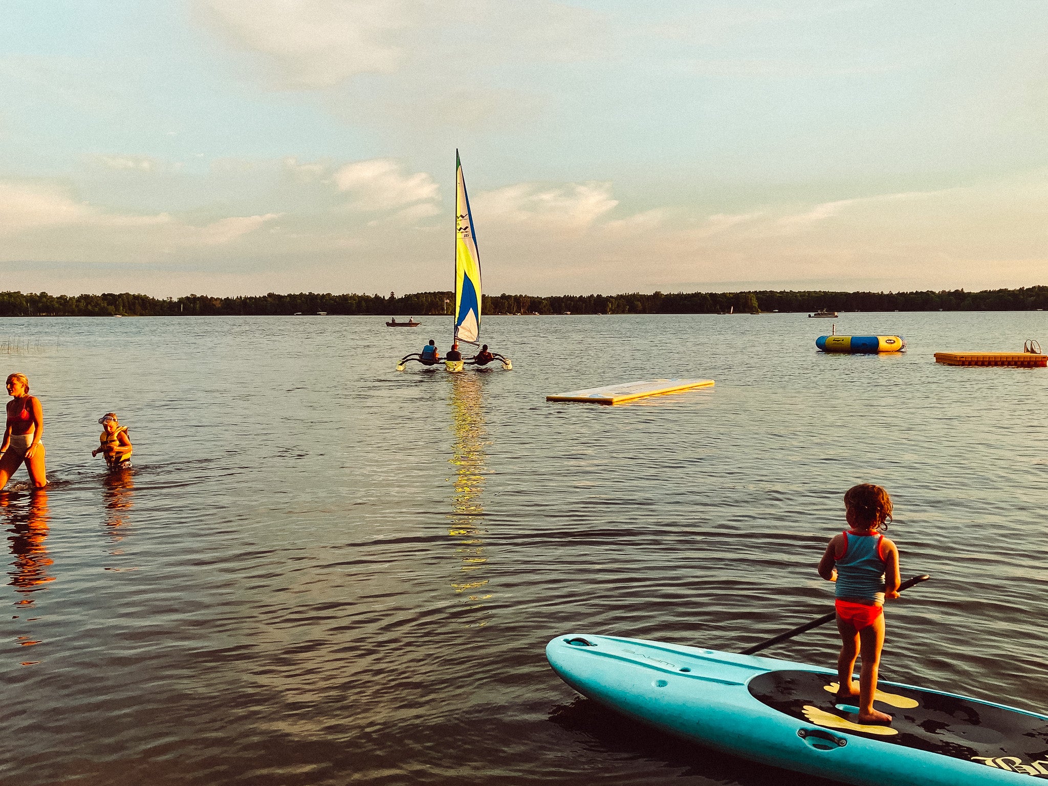 Relax on the sandy swimming beach that features a swim raft, water trampoline, canoes, aqua cycle, paddleboards, & kayaks, & we also have free bicycles for all ages available for a ride around the resort/area.