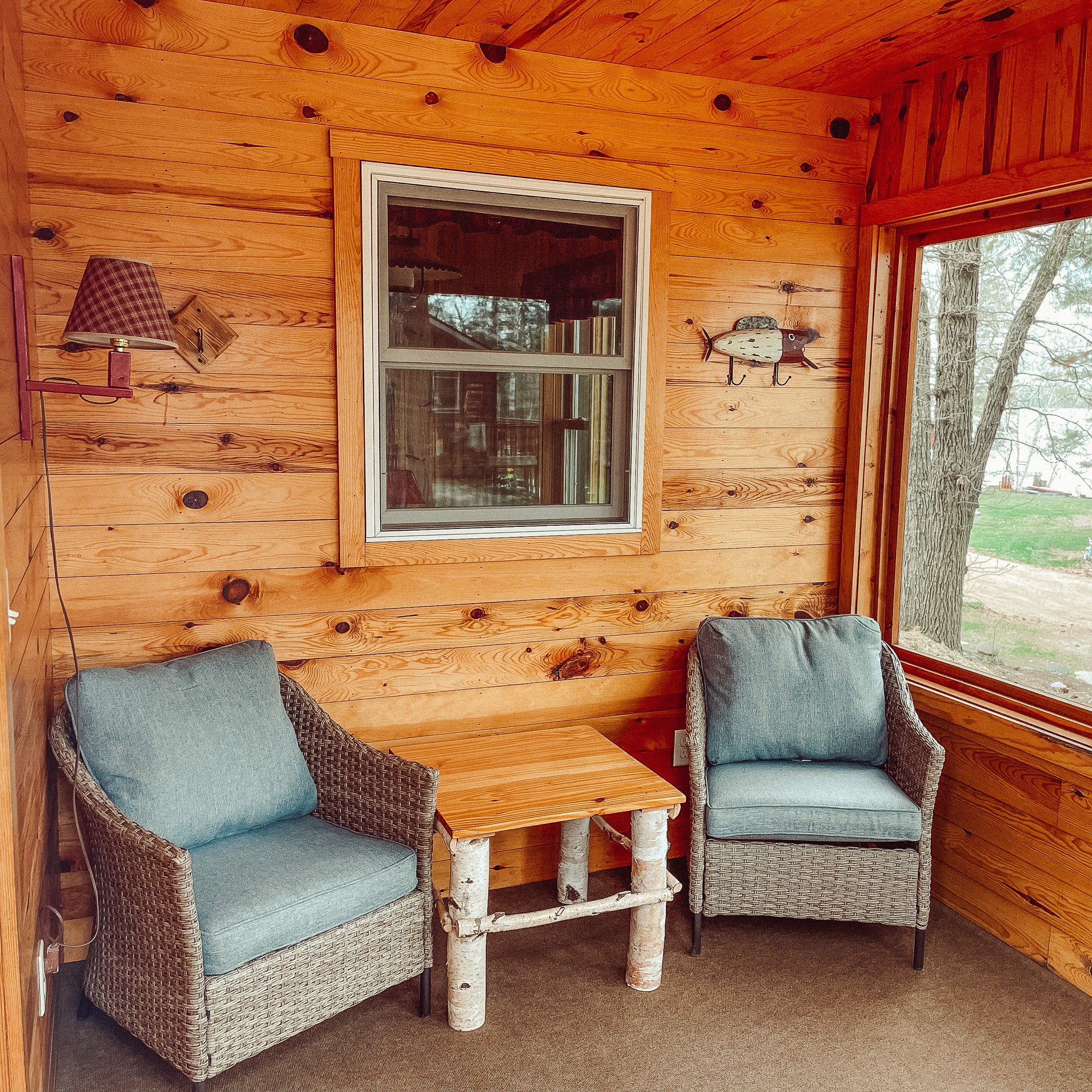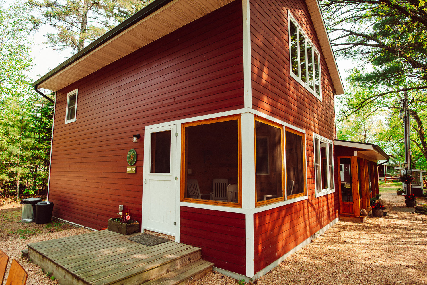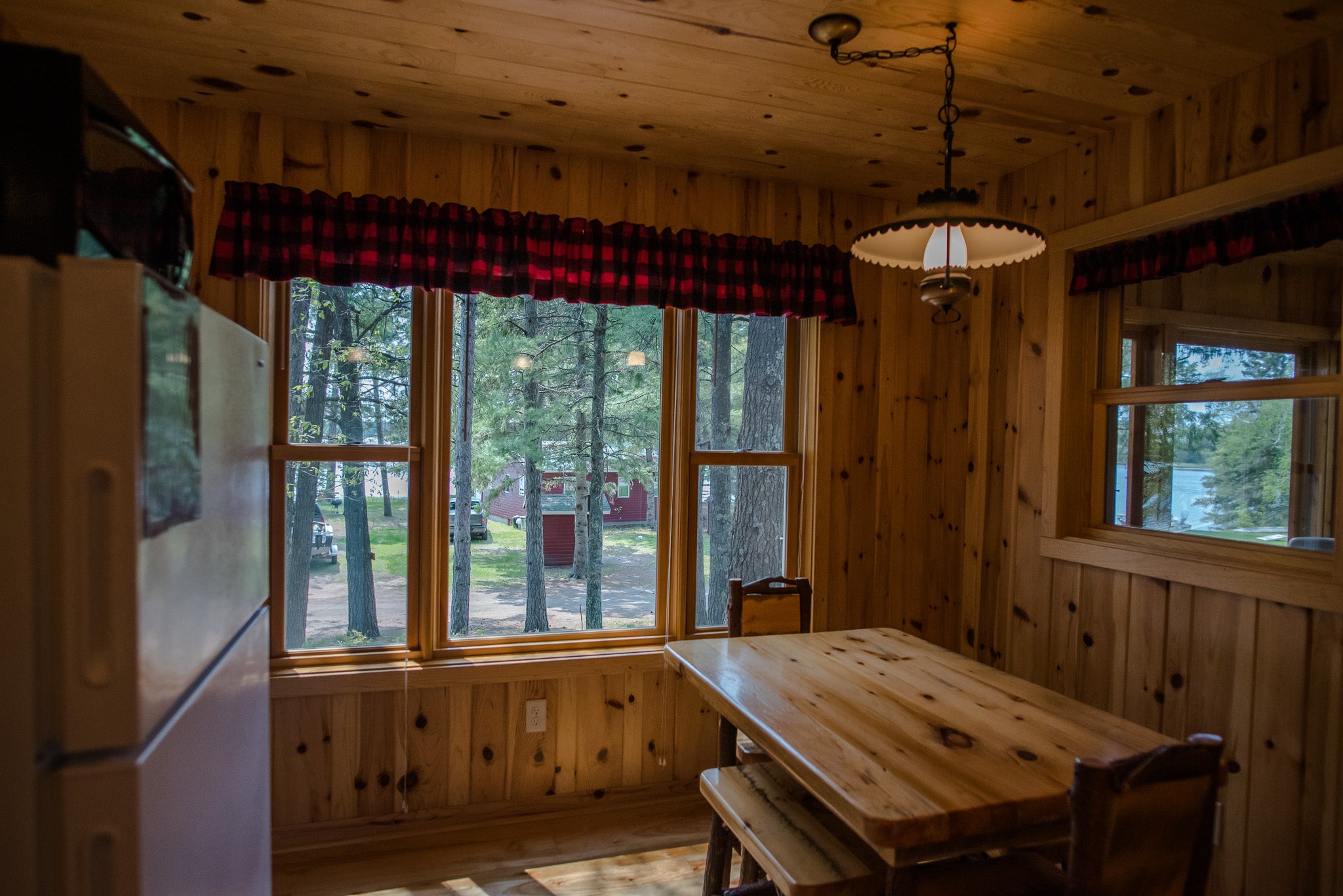 It gets it’s name from the view out the big windows upstairs, overlooking the resort. Cute and comfortable, this two story cabin has a knotty pine interior, warm northwoods craftsmanship, a screen porch and plenty of windows facing the lake. It is our only 2 bedroom cabin with 1½ baths (tub/shower on main floor, ½ bathroom upstairs). Full kitchen. Window A/C and heat.