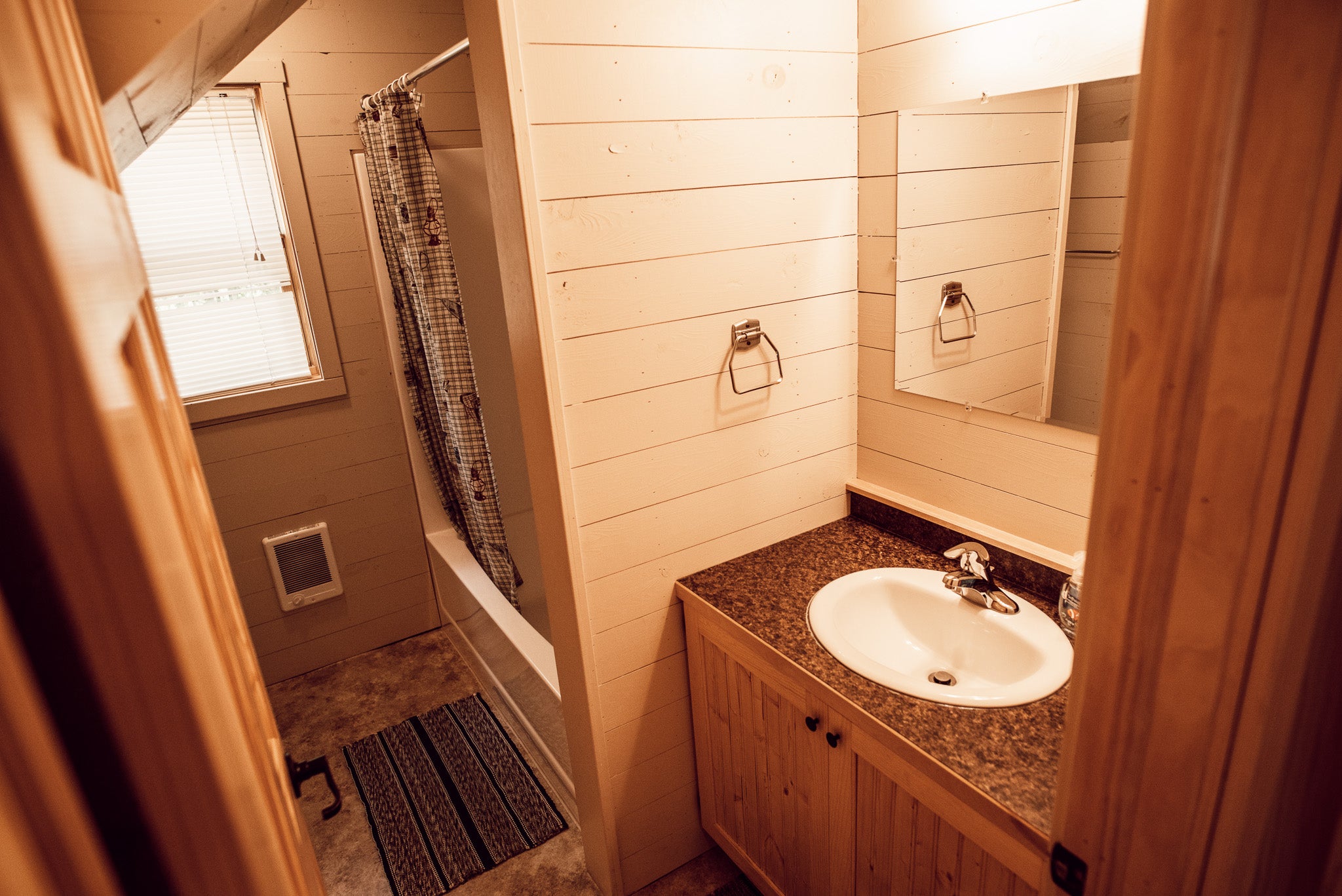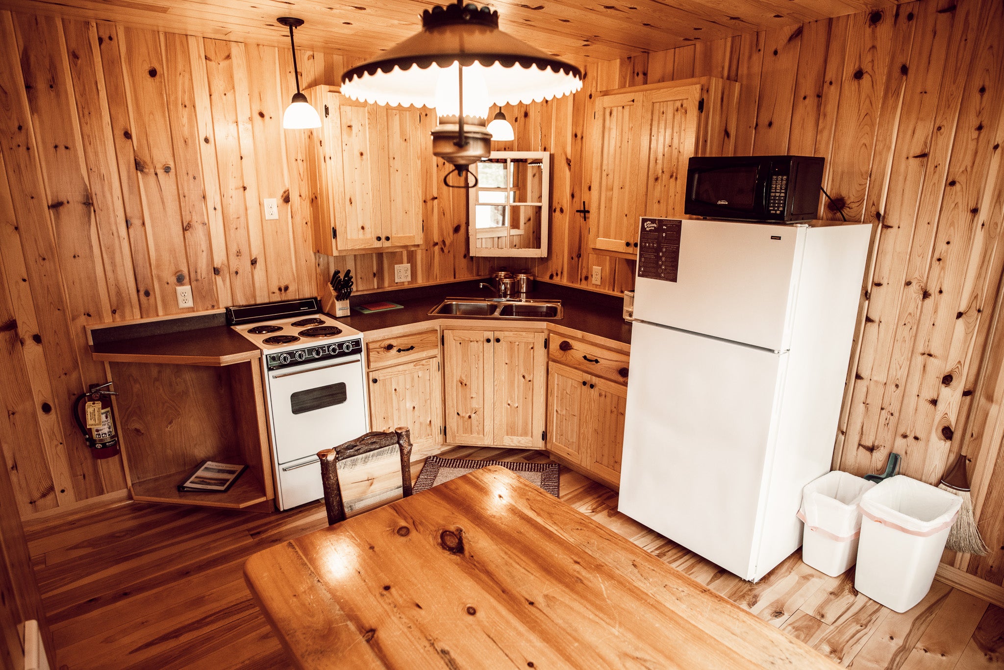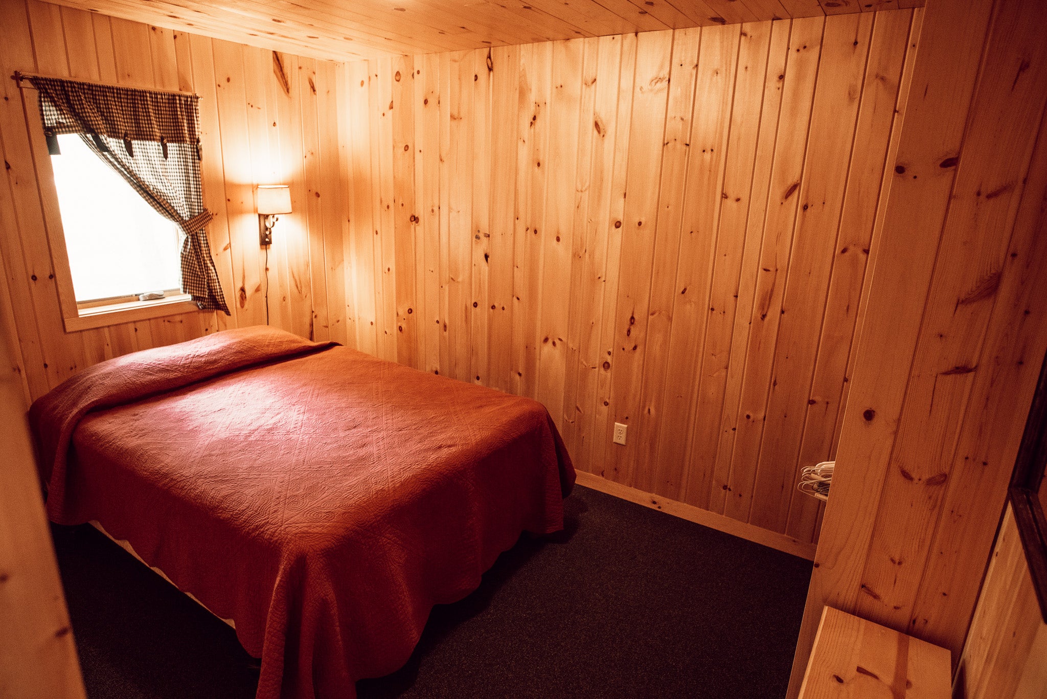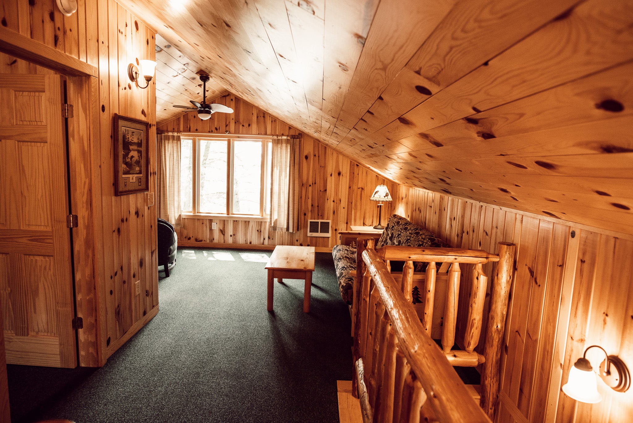 It gets it’s name from the view out the big windows upstairs, overlooking the resort. Cute and comfortable, this two story cabin has a knotty pine interior, warm northwoods craftsmanship, a screen porch and plenty of windows facing the lake. It is our only 2 bedroom cabin with 1½ baths (tub/shower on main floor, ½ bathroom upstairs). Full kitchen. Window A/C and heat.